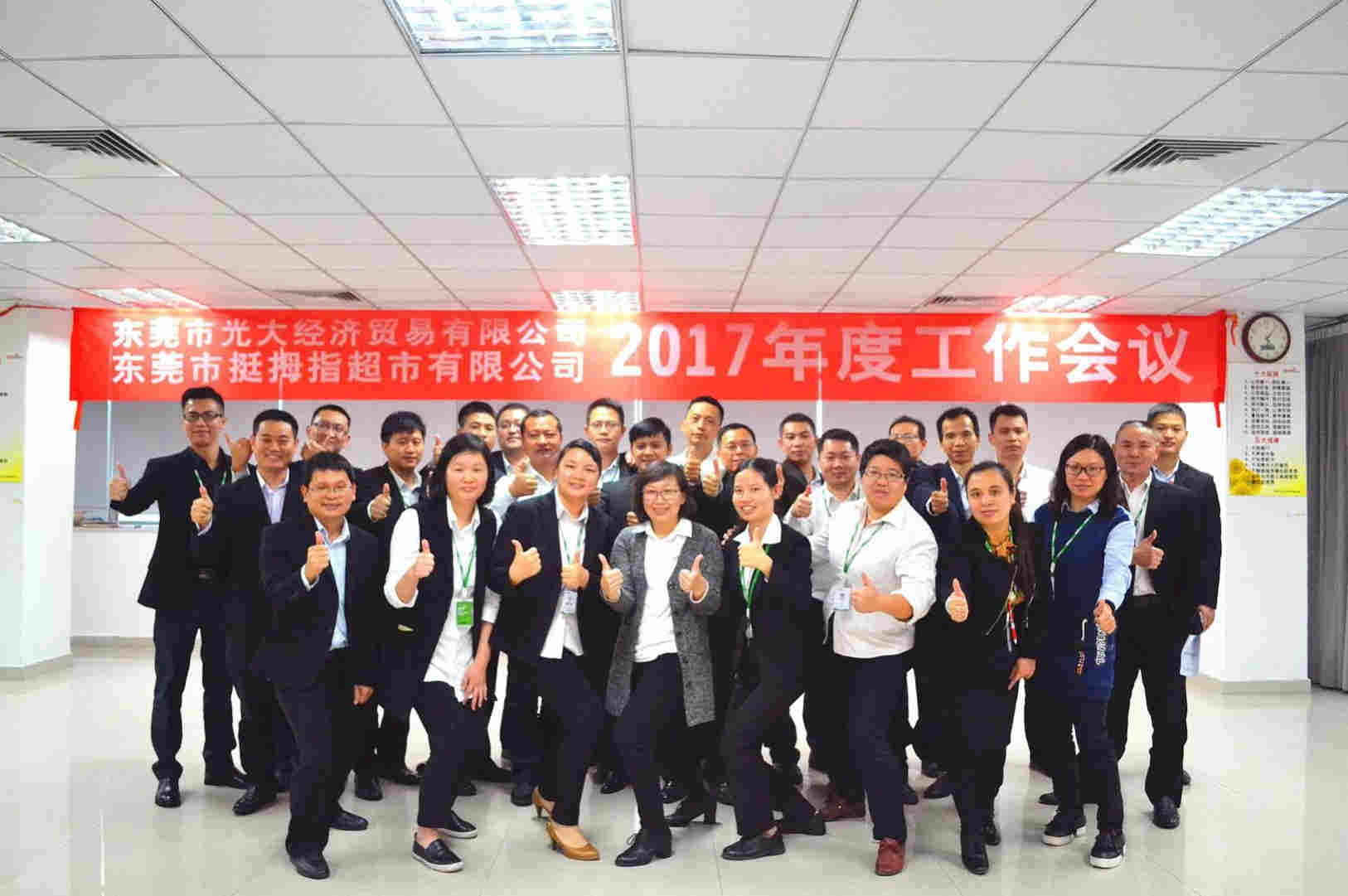 東莞市光大經濟貿易有限公司(挺拇指生活超市)2017年度工作會議于2016年12月19日在光大總部召開,公司常務副總蓋莉君女士、各職能部門負責人及各門店店長出席了會議。